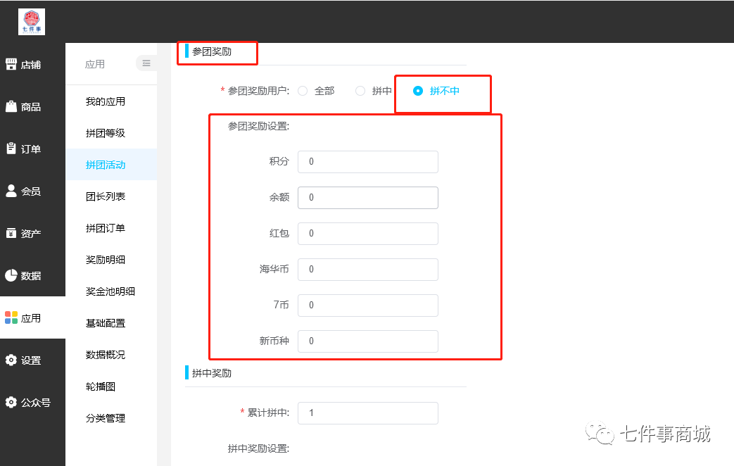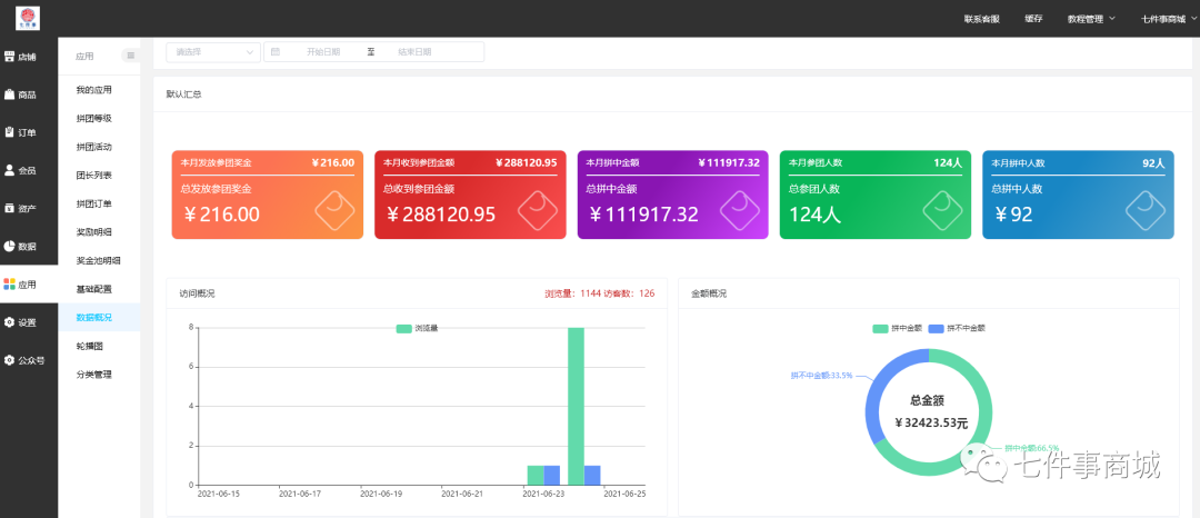 更新简章 01-红包拓客:实现拉新与转化一体 02-装修:自定义装修告别千篇一律 03-汇聚支付:商城支付服务零风险 04-幸运拼团:强社交、快裂变工具 05-刮刮卡:趣味营销提升商城人气 红包拓客 实现拉新与转化一体 功能介绍: 邀请好友立即拆红包,实现快速拉新,转化消费。消费者通过升级、消费、好友转让获得红包余额,获得的红包余额可以进行商品现金折扣、邀请好友一起抢红包、红包余额提现。 功能亮点: 红包拓客工具帮助商家实现了快速拉新与转化消费于一体; 返现机制:每天万分之5递减解冻(类似银联惠模式), 每日定时抢红包红包金额0-100随机设置; 获得机制:会员分享海报,会员扫码,分享人跟扫码人获得余额红包,签到获得红包,会员购买商品获得余额红包,团队下级购买余额红包获得; 商品设置:独立设置,余额红包,可以走分销,经销,股东,区域分红设置,支持余额红包购物抵扣。 管理后端展示: 用户前端展示: 新增装修组件 自定义装修告别千篇一律 功能介绍: 我们对商品详情页装修设置做了大规模的优化调整,并新增了许多新的组件和模块。 功能亮点: 店铺展示全面DIY,告别千篇一律,能让大家按照自身的品牌调性和实际需要,编辑自己的商品详情页,提升留存率和复购率。 管理后端展示: 汇聚支付 商城支付服务零风险 功能介绍: 帮助商家接入汇聚支付服务,提供0风险的支付服务,实现扫码、H5页面、小程序、APP等多种支付方式,完成收款、退款、代付,公转私合理避税。 功能亮点: 不改变用户的支付习惯,支持微信、支付宝; 平台收款可以直接转私账,利润进公账; 规避税务风险,降低增值税/企业所得税; 支持聚合二维码收款,让门店收银更方便; 推广员商家可以直接通过汇聚代付到私账。 操作后端展示: 幸运拼团 强社交快裂变营销利器 功能介绍: 多人参与团购,其中X人拼中获得物美价廉的商品,还有机会赢得奖金池分红,剩下未拼中的人获得奖励,该奖励可以用于商城内的消费,拼的越多赚的越多。 功能亮点: 参与即可受益,不会有任何损失。不仅可以鼓励没有拼中的会员继续参与活动,还可以让其主动分享传播活动给好友促使成团,可实现高效裂变,从而带动销量。帮助商家做好用户留存的问题,增强粘性,不容易造成用户流失。 操作后台: 用户前端展示: 刮刮卡 趣味营销提升商城人气 功能介绍: 刮刮卡是一个抽奖活动:后台可设置多个奖品让用户进行刮卡抽奖。奖品分为五种类型:红包、余额、优惠券、积分、商品; 可设置用户参与抽奖的次数,可按天或者按总次数设置,例如:一天10次或一人总共10次; 可设置用户需要消耗 n 积分才可抽奖一次; 可设置用户中奖的概率。 功能亮点: 商家可以通过刮刮卡活动,吸引更多的客户参加,提升商城人气,增加新客户二次到访,提高老客户成交率,提高商城受众群; 这类趣味营销形式,除了可以有效吸引用户互动,建立起商家与用户的联系,以此激发用户复购率和提升用户忠诚度。此类视觉互动营销也有助于强化品牌信息和记忆点。 管理后端展示: 用户前端展示: 广东七件事集团是一家专注于为智慧零售提供技术解决方案的平台型企业,业务涵盖产业互联网中台,数字供应链中台,行业SAAS中台,企业数字中台解决方案。 公司以投行的视角,通过多维度、系统化的服务体系,围绕企业价值体系为核心进行系统开发,为企业搭建数据价值链模型,帮助企业实现数据价值最大化。